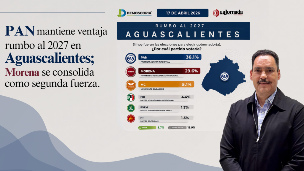 En el más reciente tracking electoral rumbo a la elección de gubernatura en Aguascalientes, el Partido Acción Nacional (PAN) se posiciona como la primera fuerza política con el 36.1% de la intención de voto, seguido por Morena con 29.6%, de acuerdo con la medición más reciente de Demoscopía.